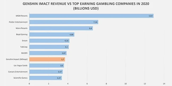 Также пользователь Reddit сравнил доход с компаниями из сферы азартных игр – в нем Genshin Impact оказалась на восьмом месте.
