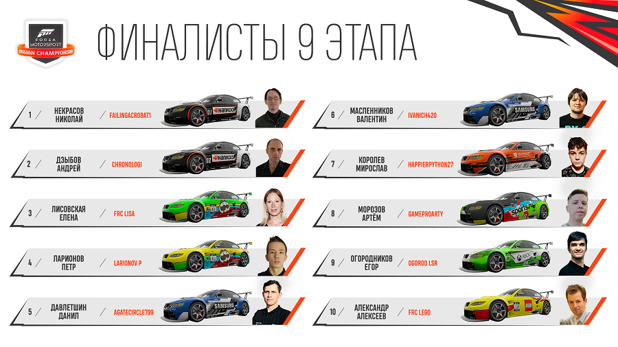 Финал девятого этапа Всероссийского Чемпионата Forza Motorsport 2021 состоится 7 ноября в 18:00. В заключительной стадии этапа по итогам отборочных гонок, примут участие 17 человек и 3 гостя финала.