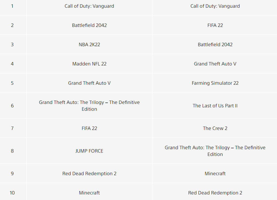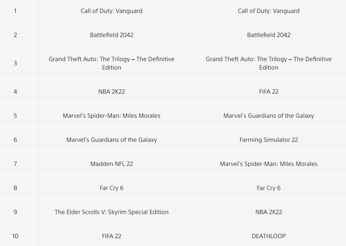 Call of Duty: Vanguard, Battlefield 2042 и ремастеры GTA возглавили ноябрьский топ продаж PS Store