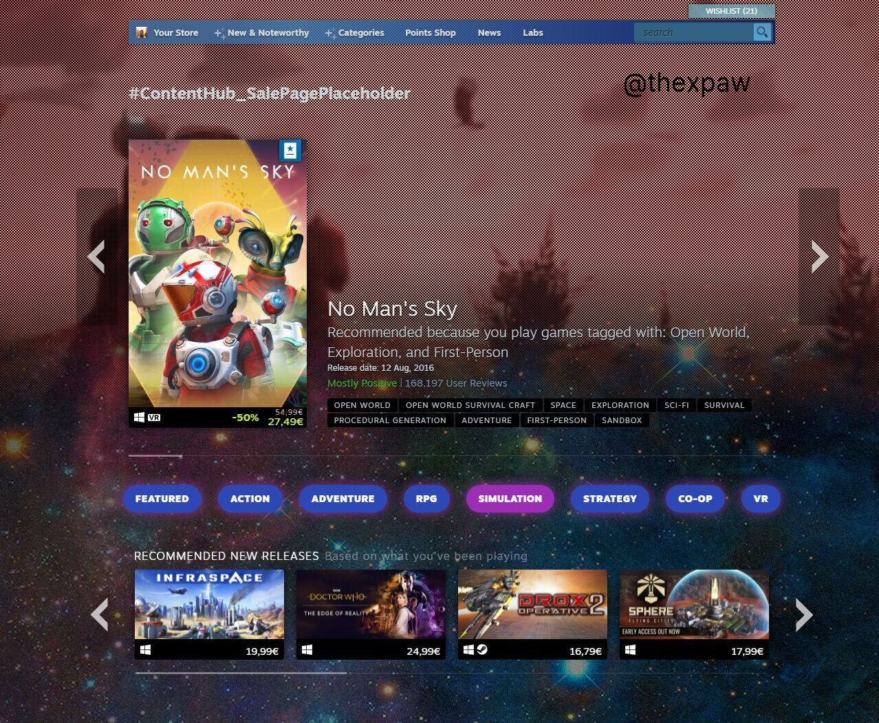 Была обновлена карусель рекомендаций в верхней части страницы. Она теперь учитывает рейтинг обзоров, метки, дату выпуска. Steam также начал показывать новости, информацию об обновлениях и событиях в играх, которые находятся в библиотеке пользователя или списке желаемого.