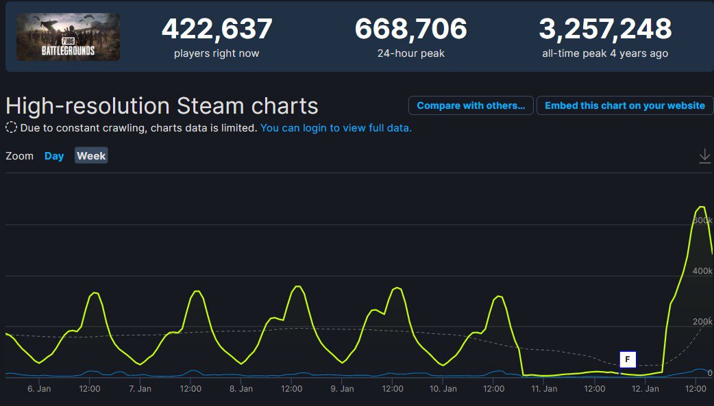 Пиковый онлайн PUBG в Steam превысил 668 тысяч игроков после перехода на F2P