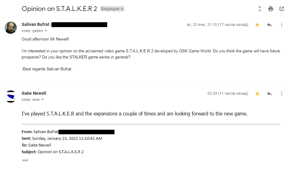 «Я играл в «Сталкер» и дополнения несколько раз. С нетерпением жду вторую часть», – ответил Гейб в электронном письме к одному из поклонников.