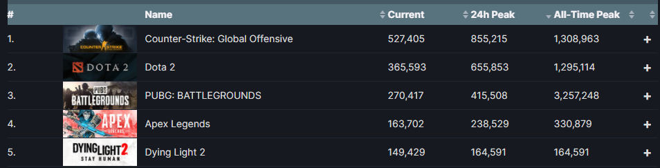 По суточному онлайну игра вошла в топ-5 на платформе, уступив CS:GO, Dota 2, PUBG и Apex Legends.