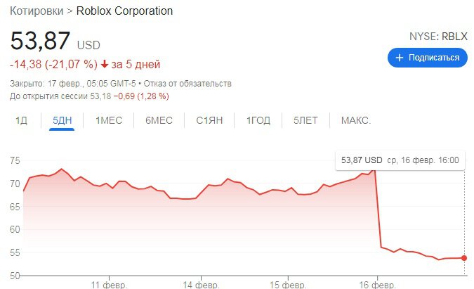 Выручка платформы хоть и показала рост (на 20%), но оказалась ниже, чем прогнозировали аналитики. Акции Roblox подешевели с 73 до 53 долларов за штуку.