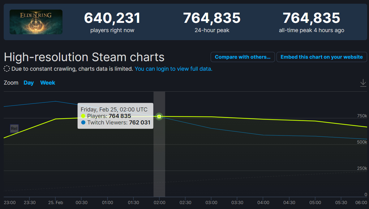 Согласно данным Steam DB, пиковый онлайн в Steam достиг 764 835 игроков. Это стало лучшим запуском для FromSoftware, а также лучшим стартом для издателя – Bandai Namco. Прошлый рекорд для FromSoftware установила Dark Souls 3 в 2016 году – 129 тысяч человек.