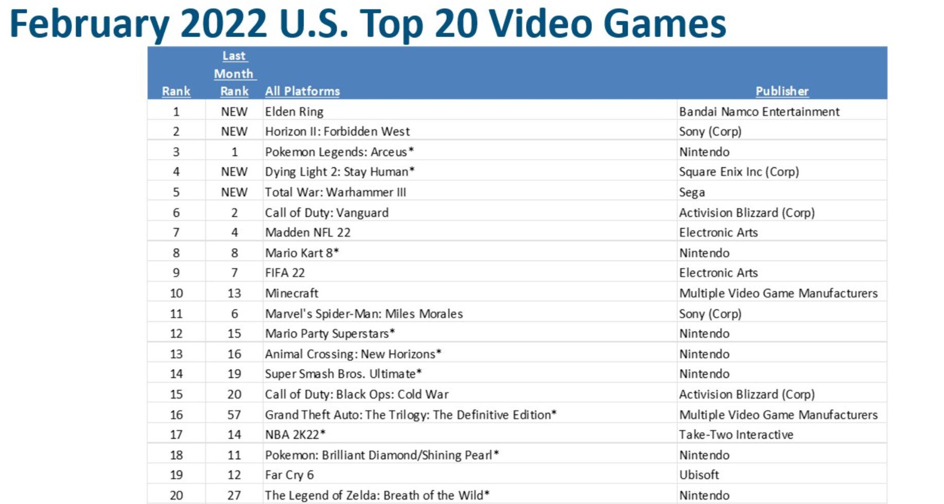 Elden Ring стала самой продаваемой игрой в феврале в США.