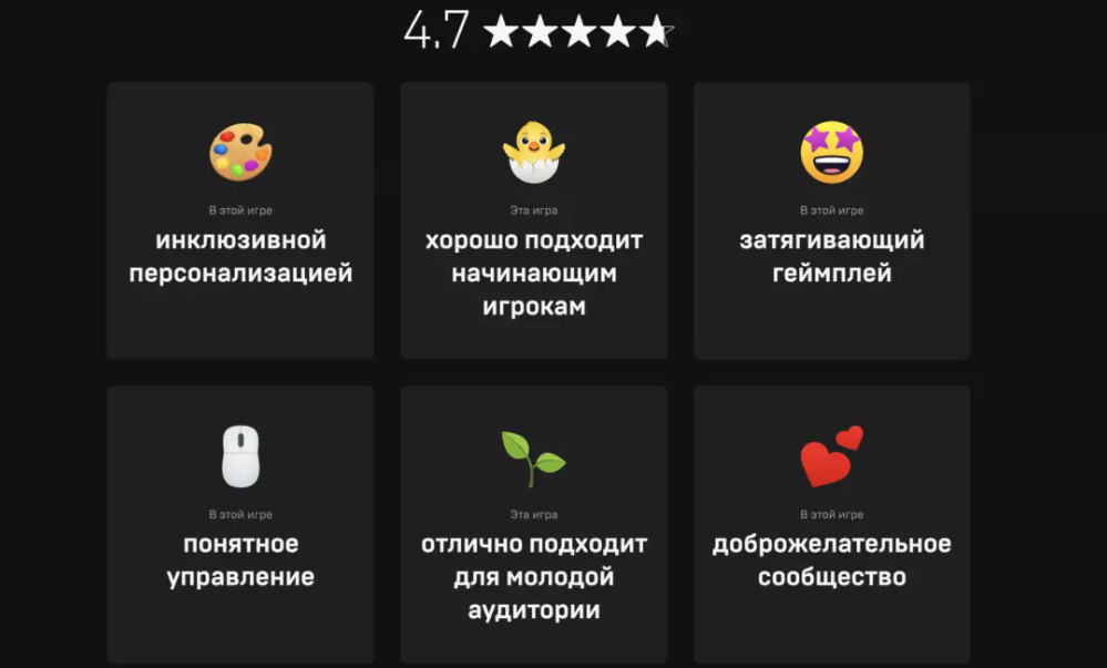 Игрокам предлагают оценить игру по пятизвездочной системе и выбрать ее отличительные особенности. Потому эта информация показывается игрокам на странице магазина.