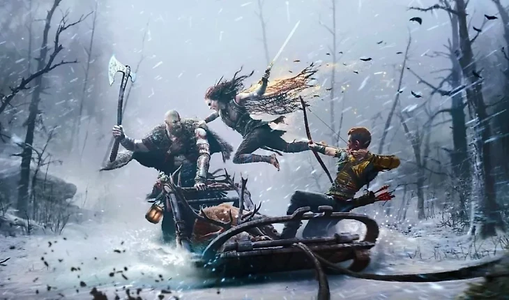 На арте изображен Кратос, который вместе с сыном едет на волчьей упряжке, а на них нападает Фрея.