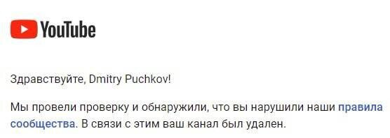 Пучков опубликовал скриншот сообщения от администрации, в котором утверждается, что он нарушил правила платформы.