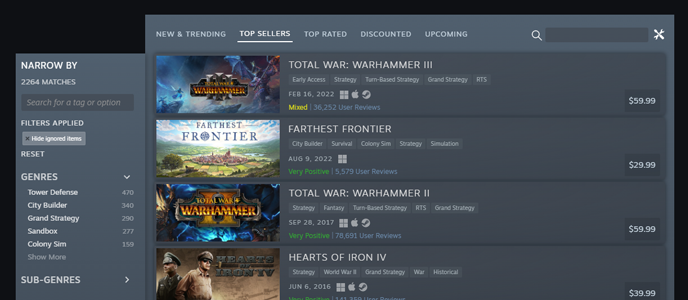 Теперь все разделы категорий, тем, жанров и меток имеют обновленную структуру со вкладками, и для некоторых категорий в Valve создали уникальную структуру.
