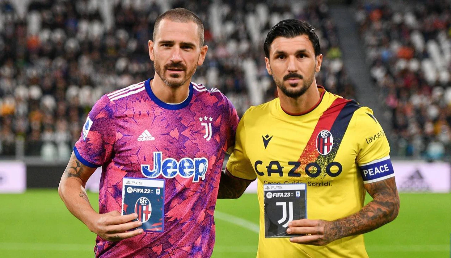 Капитаны футбольных клубов «Ювентуса» и «Болоньи» Леонардо Бонуччи и Роберто Сориано обменялись перед матчем дисками FIFA 23 для PlayStation 5.