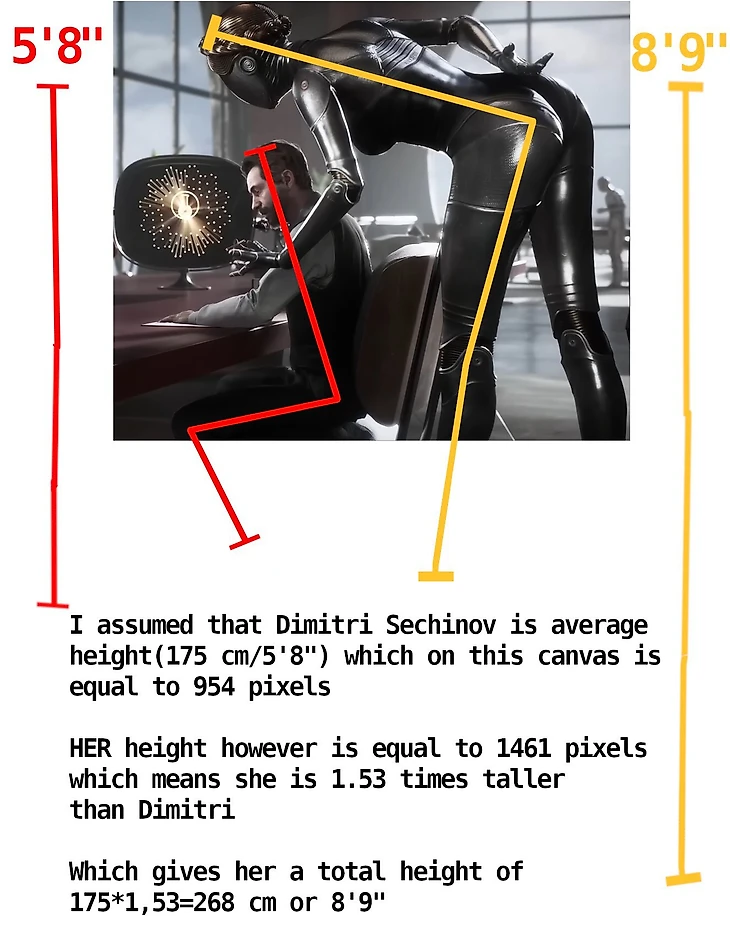 Основой своих расчетов геймер сделал скриншот игрового трейлера, где одна из балерин стоит рядом с протагонистом игры Дмитрием Сечиновым. Взяв за рост персонажа показатель в 1,75 метра пользователь вывел высоту в пикселях. По результатам операции геймер заявил, что рост роботов-близняшек — 2,68 метра.