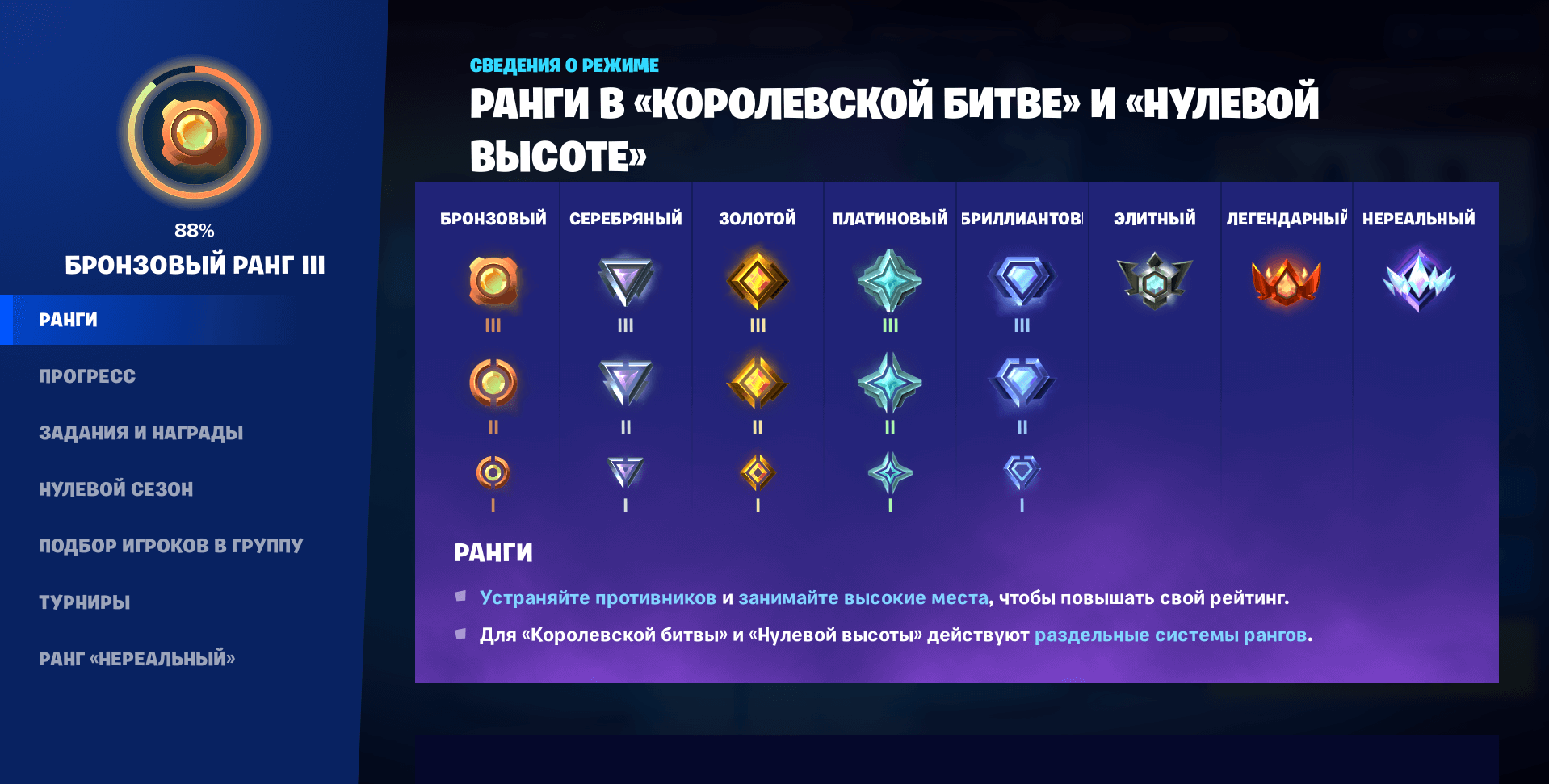 Разработчики королевской битвы добавили в игру восемь новых званий: бронзовый, серебряный, золотой, платиновый, бриллиантовый, элитный, легендарный и нереальный.
