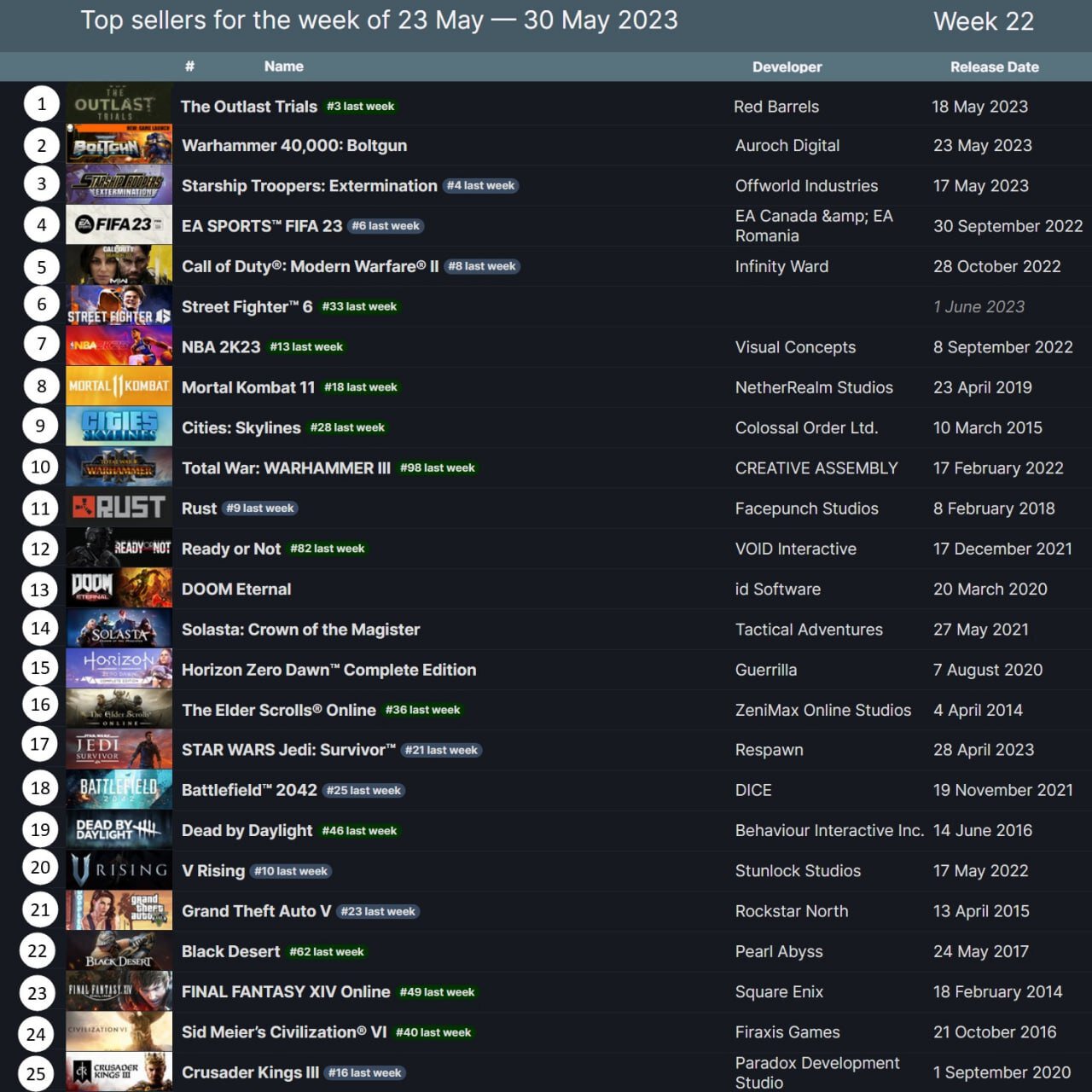 The Outlast Trials стала самой продаваемой игрой с 23 по 30 мая. Второе место заняла Warhammer 40,000: Boltgun, вышедшая 23 мая.