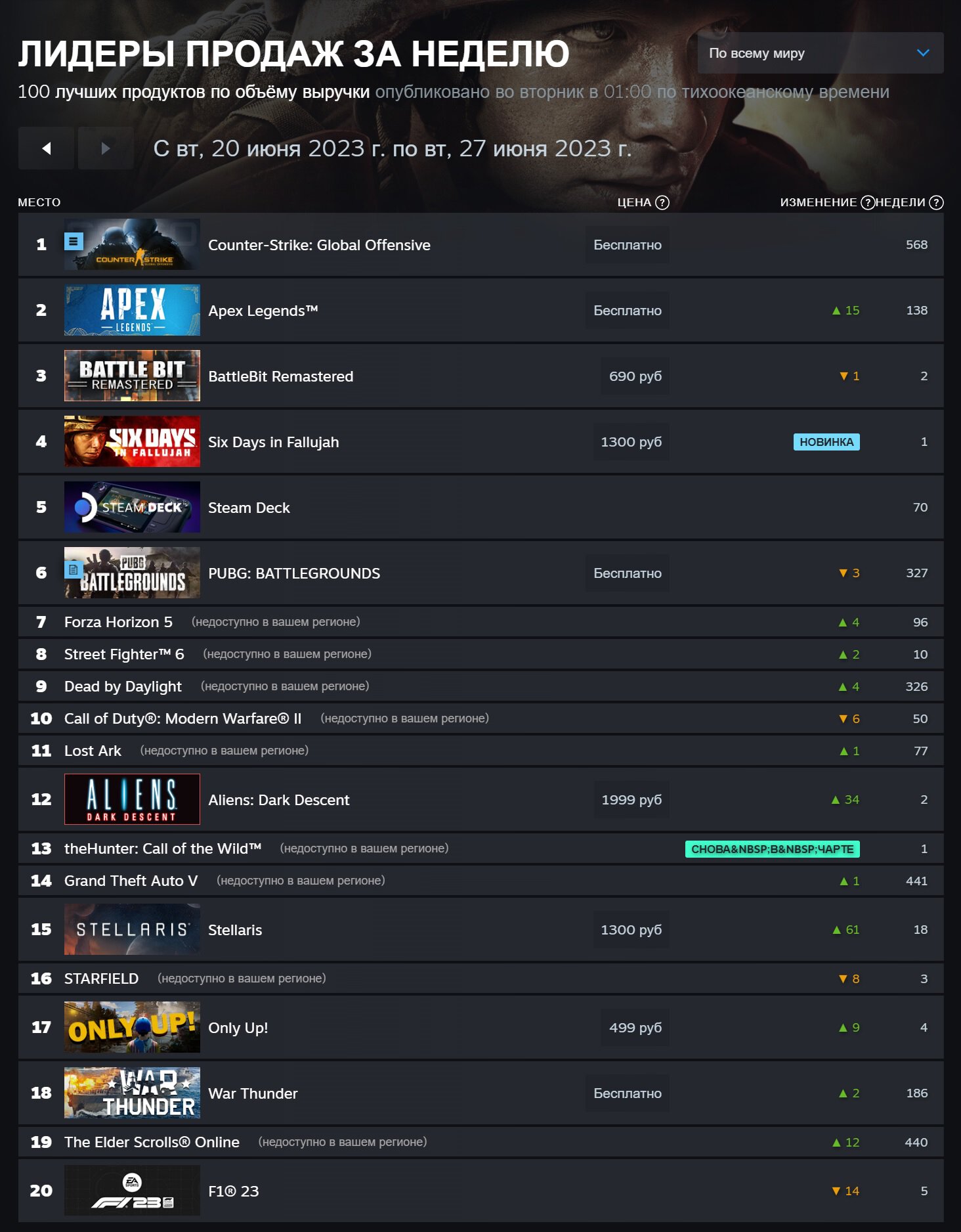 Хороший дебют показал шутер Six Days in Fallujah, забравшись в первую пятерку сразу после выхода.