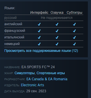 О русской локализации EA Sports FC 24 заявлено на сайте EA. На странице игры в Steam указано, что перевода не будет