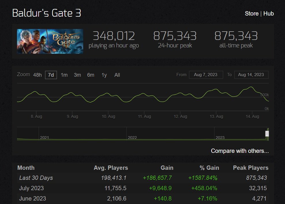 Вечер 13 августа в проект Larian одновременно играли более 875 тысяч игроков.