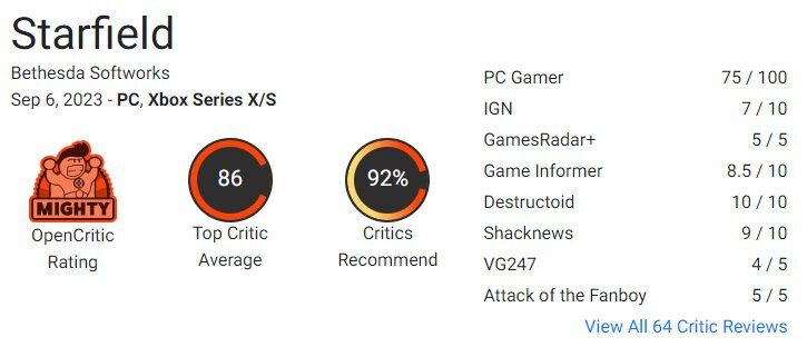 Starfield получил 86 баллов из 100 на OpenCritic