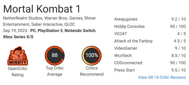 На Opencritic игра от NetherRealm набрала 88 баллов, 100% журналистов рекомендуют файтинг к прохождению.