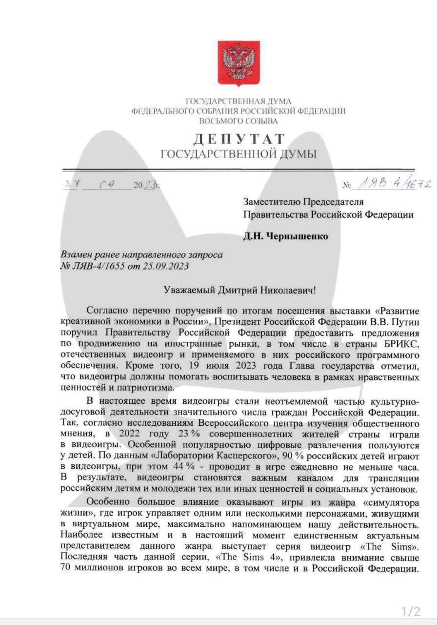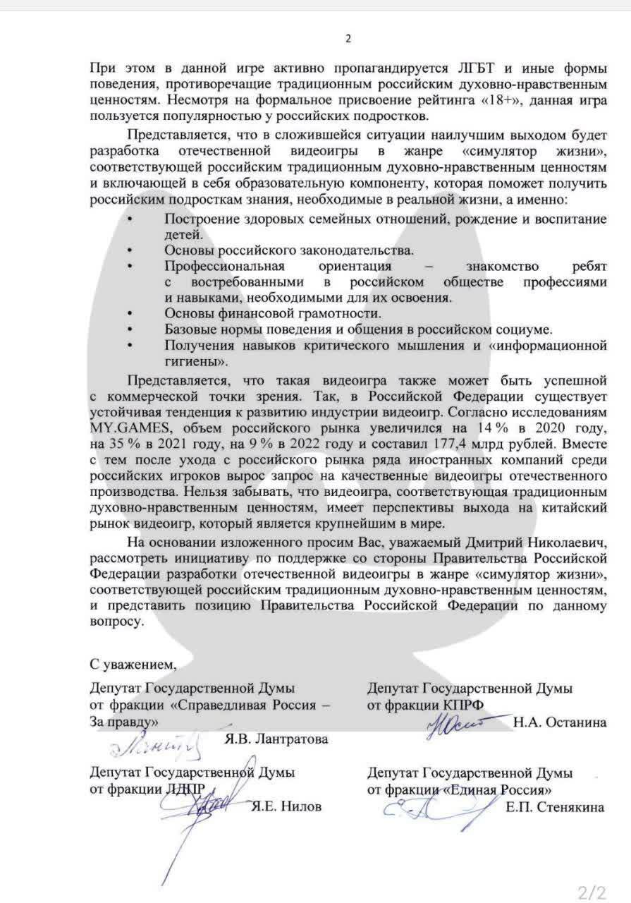Кто займется созданием аналога The Sims в России – неизвестно. Обращение к правительству подписали Яна Лантратова, Нина Останина, Ярослав Нилов и Екатерина Стенякина.