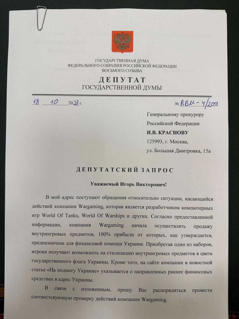 «Направил запрос по поводу донатов на нужды ВСУ в World of Tanks. (Wargaming). Деньги от продажи «раскрасок» идут «на Подмогу Украине». Совсем уже…» – заявил депутат.