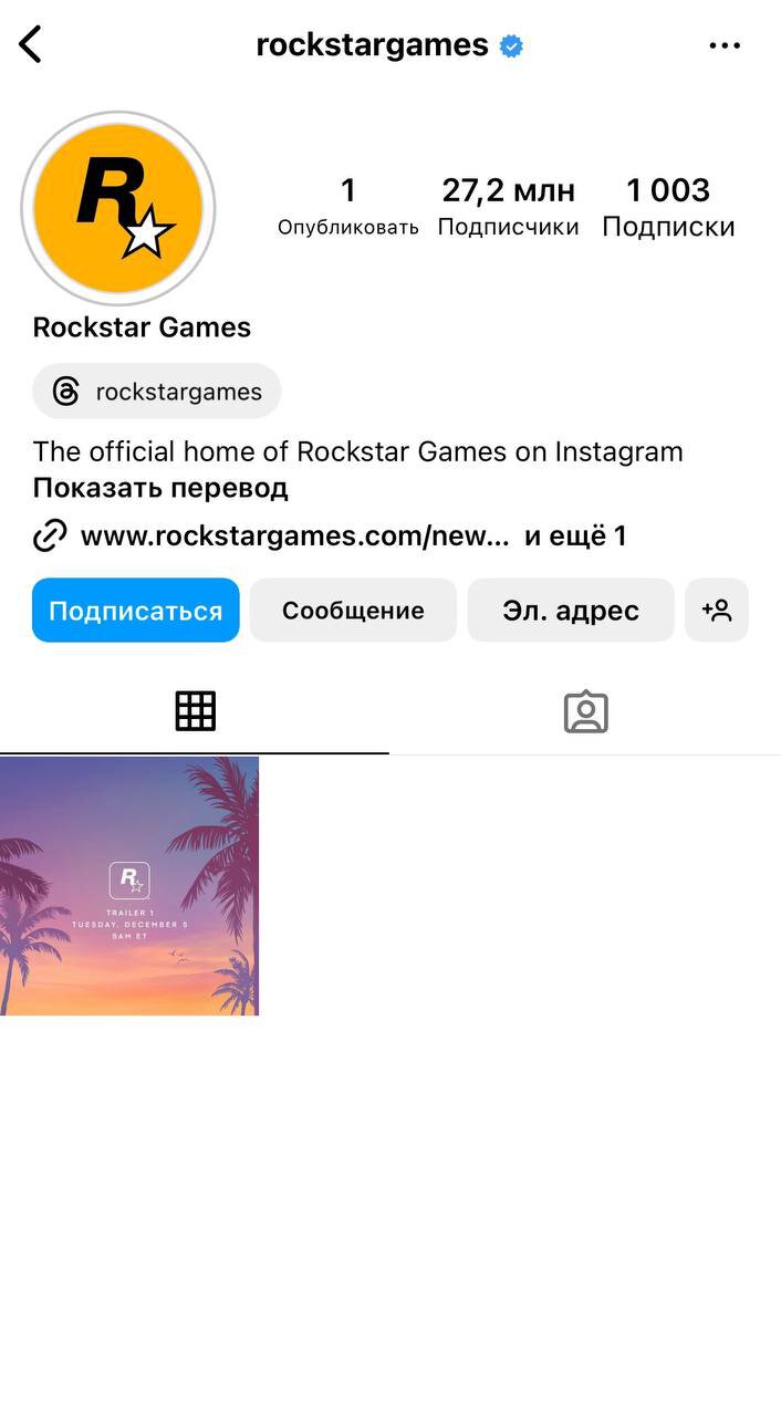 Rockstar оставила только анонс трейлера GTA 6 в инстаграме. На аккаунт подписаны 27 млн человек
