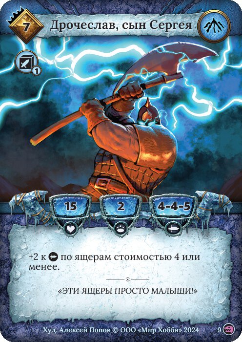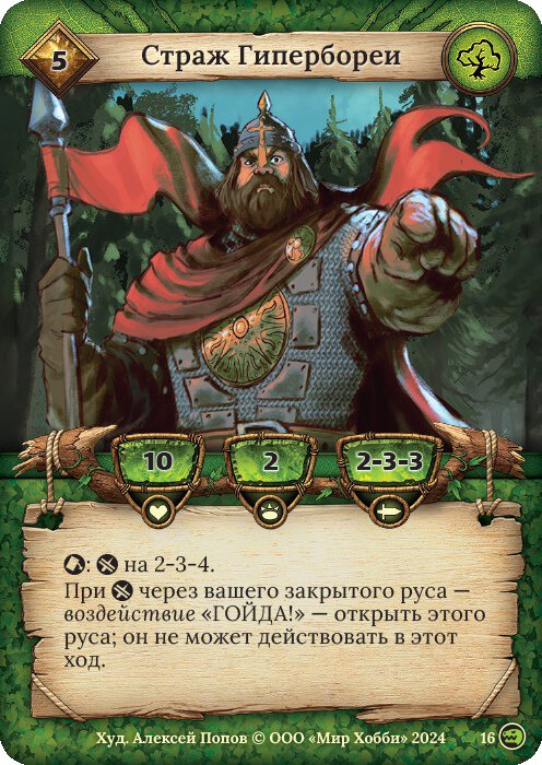В набор войдет колода Русов на 30 карт, колода Ящеров на 30 карт, 12 бустеров,  жетоны ран и эффектов, кубик, а также правила игры. Авторы также показали карты Стража Гипербореи, Дрочеслава и Филосоящера.