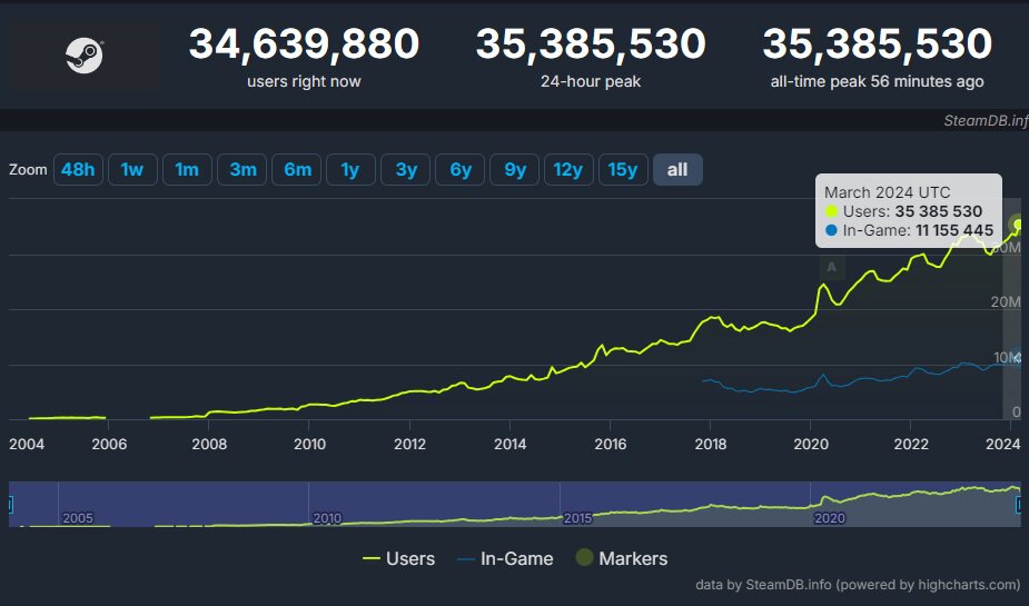 Steam установил новый рекорд по онлайну – свыше 35,3 млн игроков