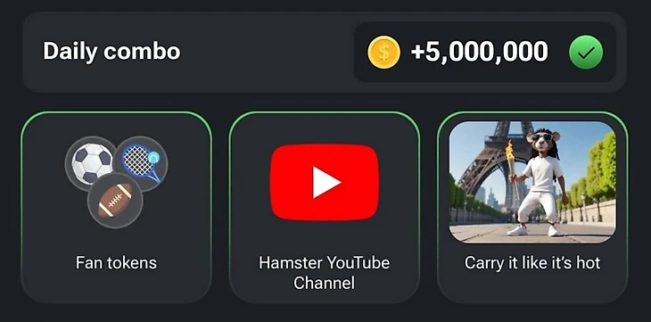 Каждые несколько дней в разделе Mine появляется новое комбо. Это секретная комбинация карт, которую нужно собрать (купить все три карточки) в Hamster Kombat для получения бонуса в 5 млн монет.