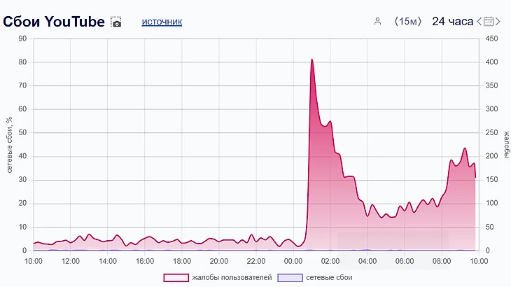 В ночь с 31 июля на 1 августа зрители YouTube сообщили о проблемах с платформой. Утром жалобы продолжают поступать, но в меньших объемах. Пользователи жалуются на то, что видеоролики на площадке не воспроизводятся.