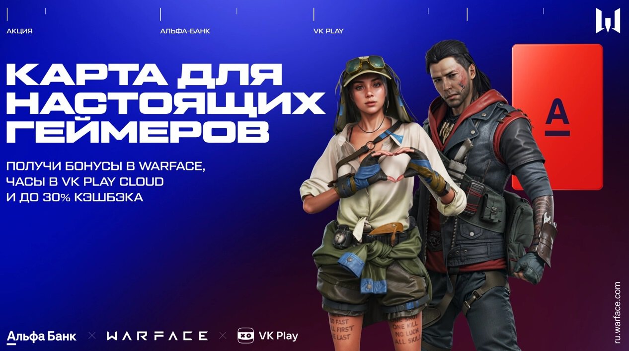 VK рассказал о расширении сотрудничества с Альфа-Банком: теперь у игроков есть возможность при оформлении специальной игровой Альфа-Карты получить до 8,5 тысячи кредитов и наборускорителей в Warface, а также 5 часов доступа к VK Play Cloud и до 30% кэшбэка на сервисы VK.