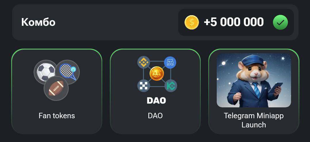 Каждые несколько дней в разделе Mine появляется новое комбо. Это секретная комбинация карт, которую нужно собрать (купить все три карточки) в Hamster Kombat для получения бонуса в 5 млн монет.