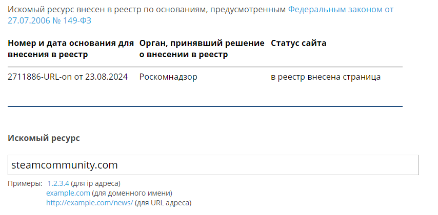 В единый реестр сайт Steam Community внесли 23 августа. Причина пока неизвестна.