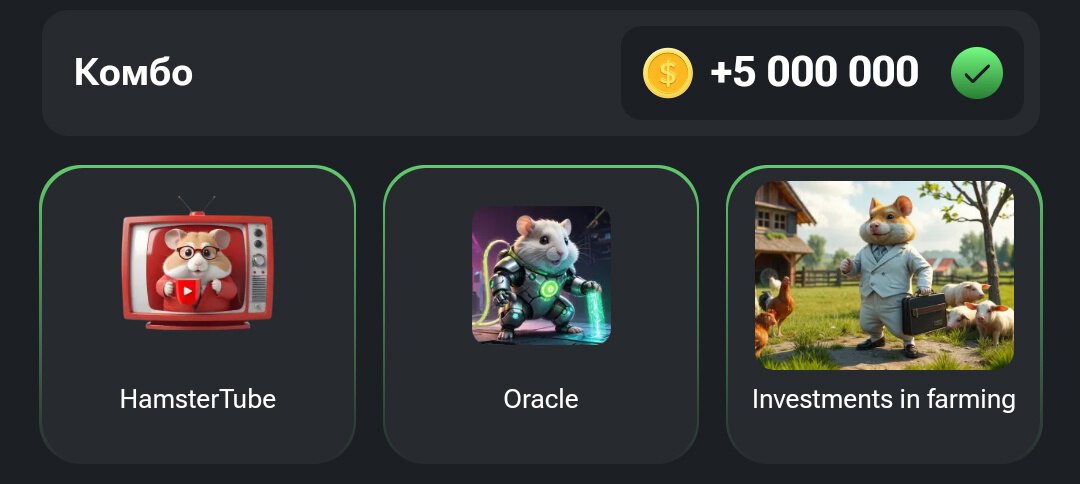 Каждые несколько дней в разделе Mine появляется новое комбо. Это секретная комбинация карт, которую нужно собрать (купить все три карточки) в Hamster Kombat для получения бонуса в 5 млн монет.