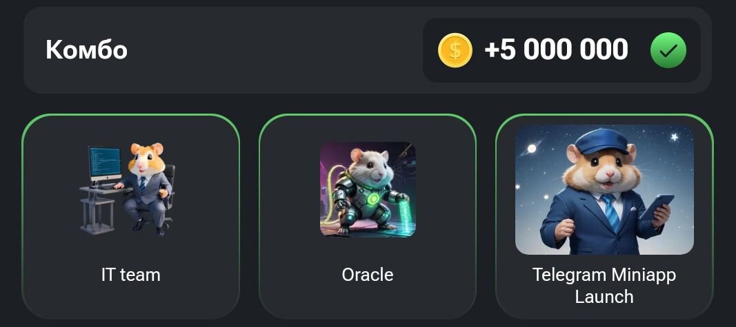 Каждые несколько дней в разделе Mine появляется новое комбо. Это секретная комбинация карт, которую нужно собрать (купить все три карточки) в Hamster Kombat для получения бонуса в 5 млн монет.