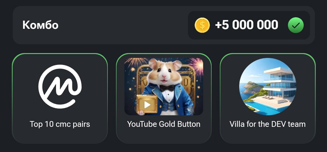 Каждые несколько дней в разделе Mine появляется новое комбо. Это секретная комбинация карт, которую нужно собрать (купить все три карточки) в Hamster Kombat для получения бонуса в 5 млн монет.