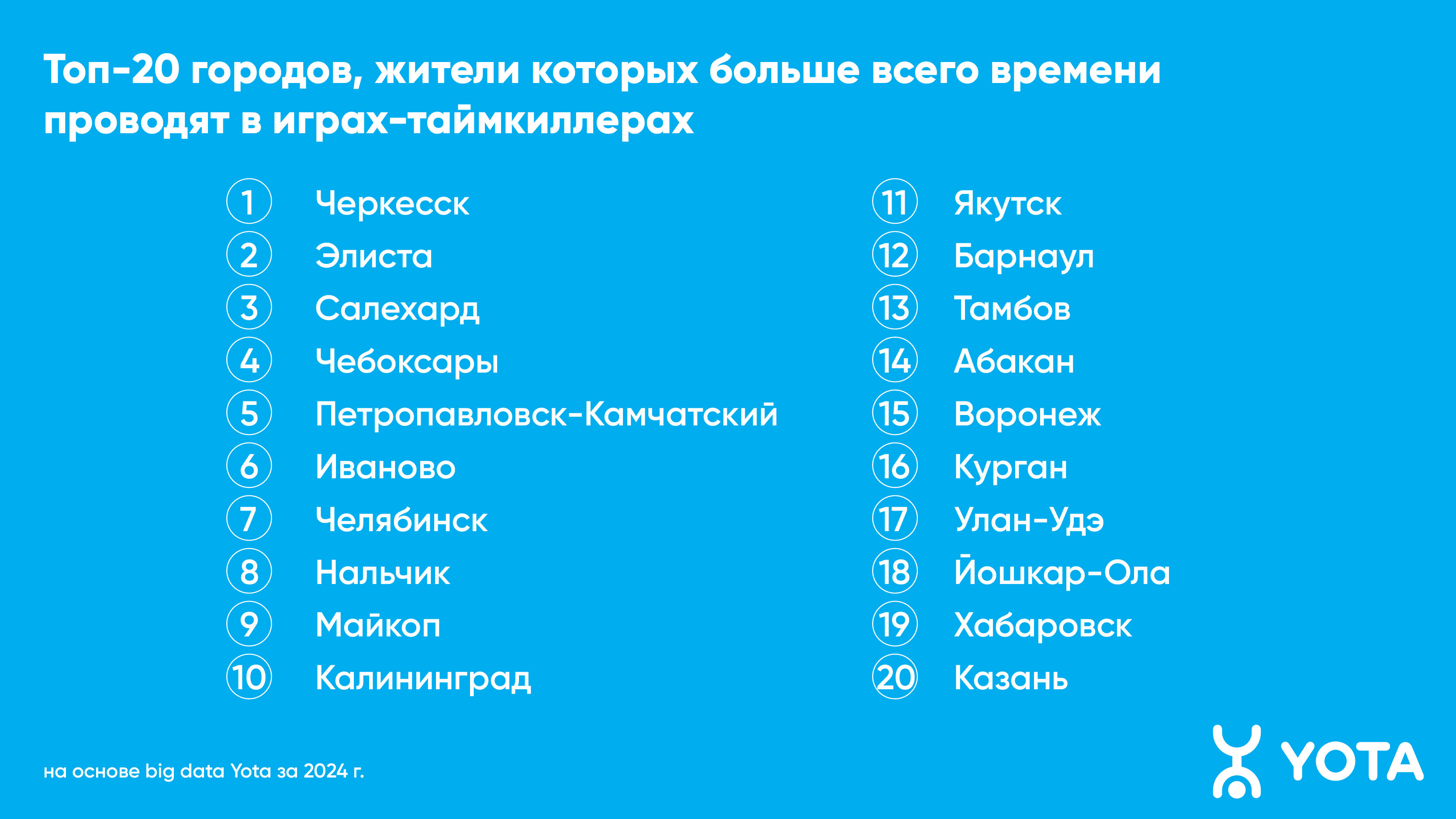 В играх жанра таймкиллер больше всего времени проводят жители Черкесска, Элисты и Салехарда.