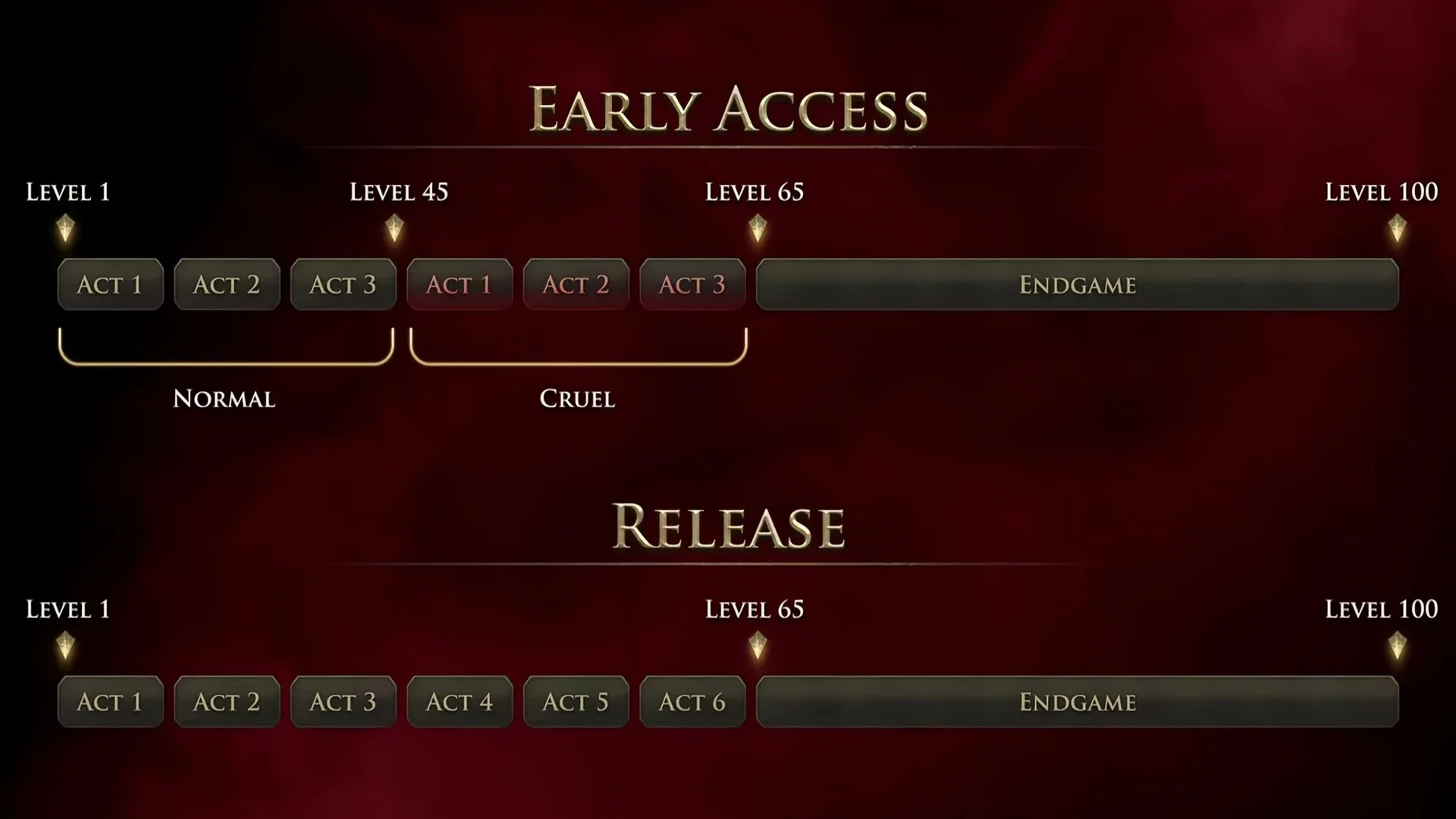 Всего в игре ожидается 6 актов. Во время раннего доступна будут доступны 3 акта на нормальной сложности, а также эти же 3 акта на повышенной сложности.