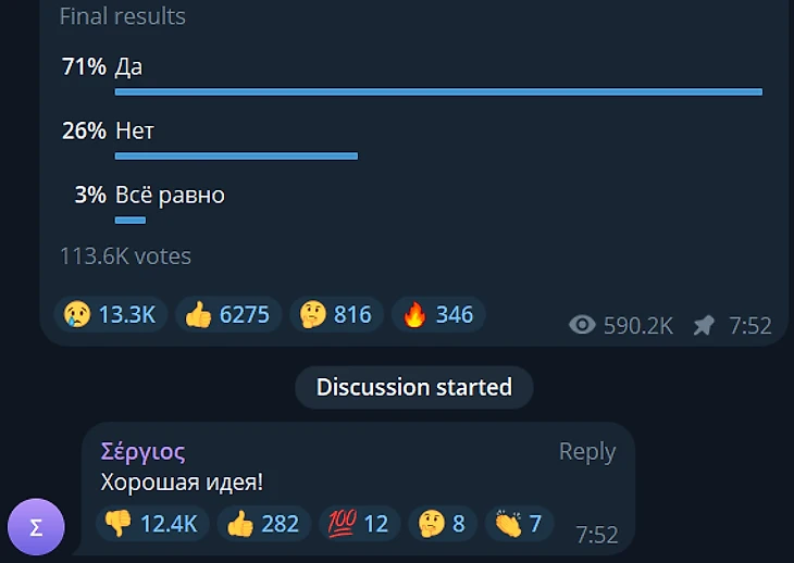 В опросе приняли участие 113,6 тысячи человек. 71% опрошенных поддержали инициативу, 26% выступили против, 3% ответили, что им все равно.