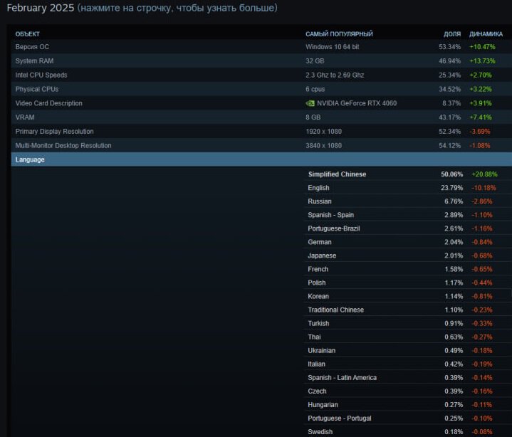 В феврале число игроков с китайским языком в Steam выросло на 20 процентных пунктов и составило 50,06% от общего числа