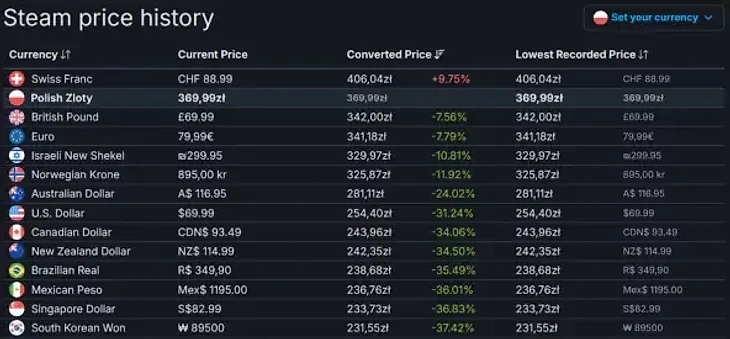 На проблему обратил внимание блогер Water CS2. В качестве примера он привел игру Metal Gear Solid Delta: Snake Eater. В США она продается за 70 долларов (около 5,8 тысяч рублей), тогда как в Польше е цена составляет 370 злотых (около 12 долларов или 8,4 тысяч рублей). Польские игроки переплачивают около 32 долларов за игру из-за политики региональных цен.