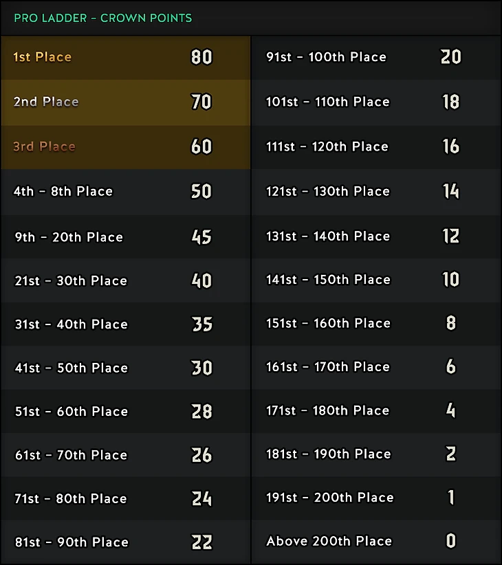 Таблица распределения итоговых мест в Pro Ladder и Очков Короны: