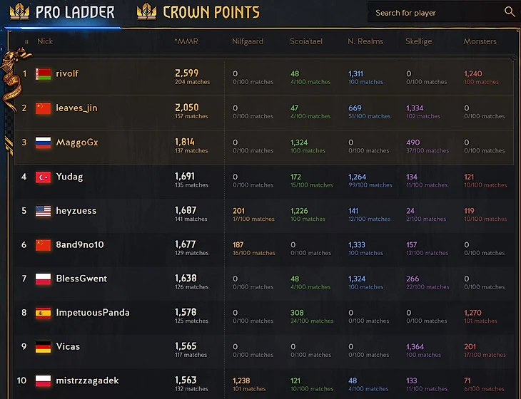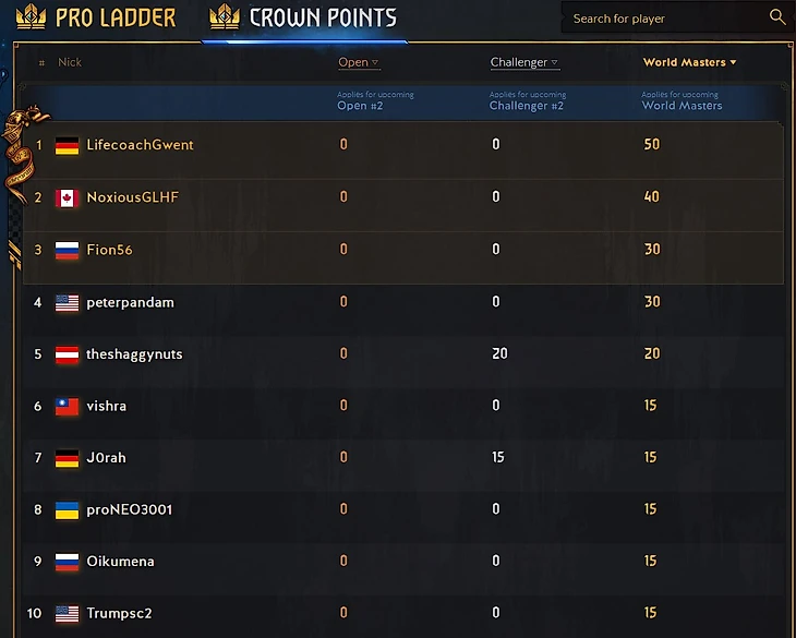Актуальный рейтинг Pro Ladder можно посмотреть здесь. Параллельно с ним доступна таблица Очков Короны (в настоящее время в ней присутствуют лишь участники первых Gwent Challenger и Gwent Open). Таблицы выглядят так: