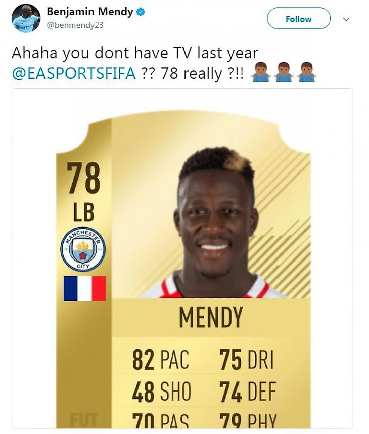 Еще один футболист, чей рейтинг действительно мог быть намного выше. Напомню, что французский защитник перешел в летнее трансферное окно из «Монако» в «Манчестер Сити». Эти ребята хоть и любят разбрасываться деньгами направо и налево, но талантливую молодежь найти могут. Менди провел шикарный сезон в «Монако», в самой игре получил карточку в команде сезона с рейтингом 86, ну и контракт с «Сити». В FIFA 18 французу дали средние статы и рейтинг 78. Правда, немного подняли основные показатели. Так, скорость Бенжамена подросла с 77 до 82, слегка увеличили и другие статы. «Хаха, EA, вы не смотрели ТВ последний год? 78? Серьезно?». Вот так отреагировал француз, когда увидел собственный рейтинг в спортивном симуляторе.