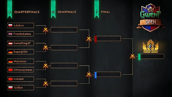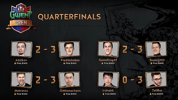 Так уж вышло, что верхняя часть турнирной сетки оказалась намного более грозной, чем нижняя. В первой игре четвертьфинала встретились, возможно, наиболее стабильный игрок Pro Ladder Андрей "Adzikov" Баль (Польша) и Фред Артур "Freddybabes" Бёрд (Великобритания), победивший в первом Gwent Slam. Сразу бросилось в глаза, что CDPR добавили очерёдность первого хода в партиях, с целью уравновесить шансы игроков.