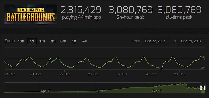 29 декабря количество одновременных игроков в PUBG достигло отметки 3 миллиона. Примерные показатели игр Steam: