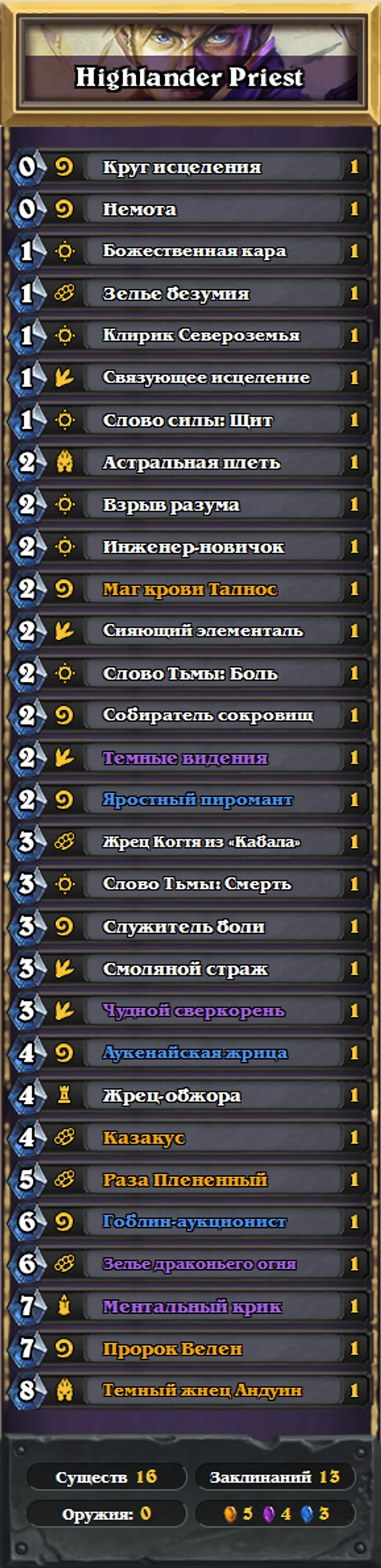 Разакус Жрец находится в топе сильнейших колод уже почти полгода. Сила архетипа базируется на комбинации «Разы Плененного» и «Темного жнеца Андуина». Раза удешевляет силу героя до 0, а ДК позволяет наносить большое количество урона из руки. Также у Разакус Жреца куча зачисток, которые отлично противостоят спам-колодам, темпо-колодам, комбо-колодам и контроль-колодам.