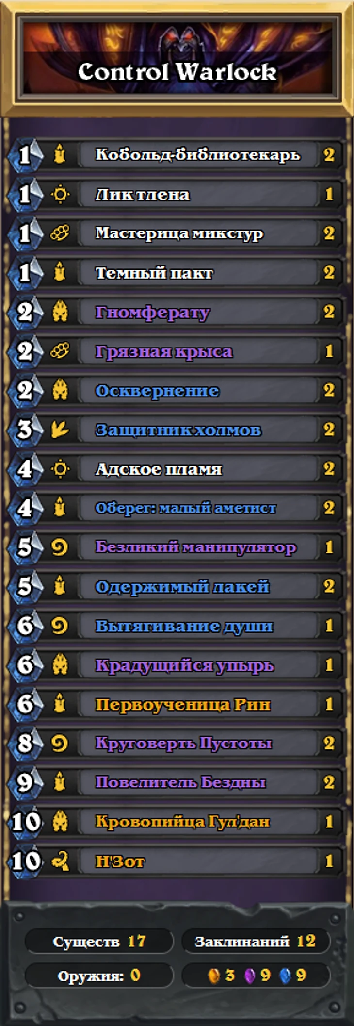 Обновление «Кобольды и катакомбы» вновь возродило старого доброго Чернокнижника. Теперь Чернокнижник – очень сильная колода, противостоять которой могут немногие даже при плохом заходе у Гул’дана. Залог победы Контроль Чернокнижника – бесконечные провокации «Повелителя бездны» и их дальнейшее возрождение при помощи ДК и Н’зота.