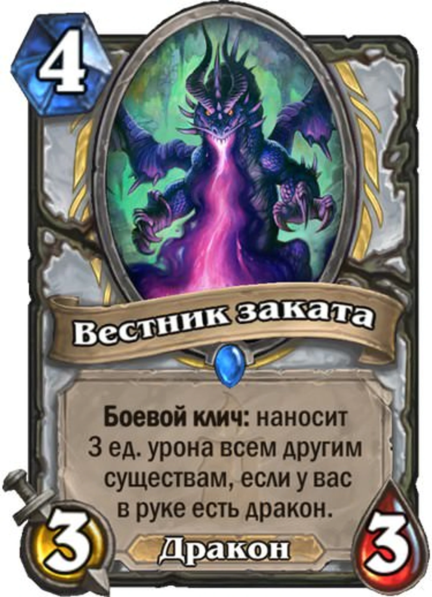 5. "Вестник заката" силен, но без перебора. Без него прист разваливается от агро колод. Можно, конечно, использовать Аукинайку + ЦОХ за те же 4 маны, но это 2 карты (сложнее найти вовремя) и становится меньше драконов, что ощутимо влияет на синергию.