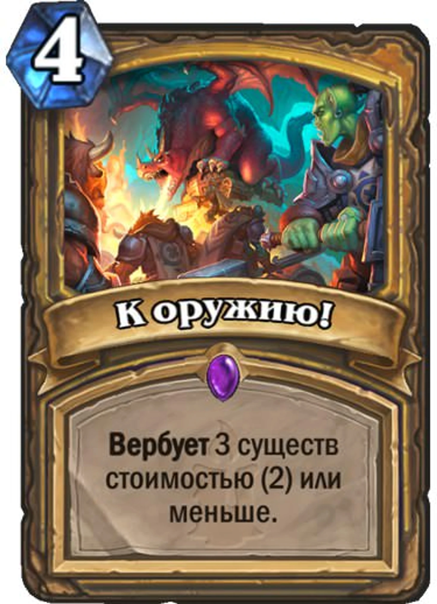 Классовая карта Паладина, заклинание за 4 маны, вербующее 3 существа за 1-2 маны из колоды. Заклинание вышло с дополнением «Кобольды и катакомбы», автоматически попав во все сборки Паладина – и агрессивного, и контрольного типа. Особенно серьезно «К оружию» усилило Агро Паладинов – Мурлок Паладина и Рекрут Паладина.